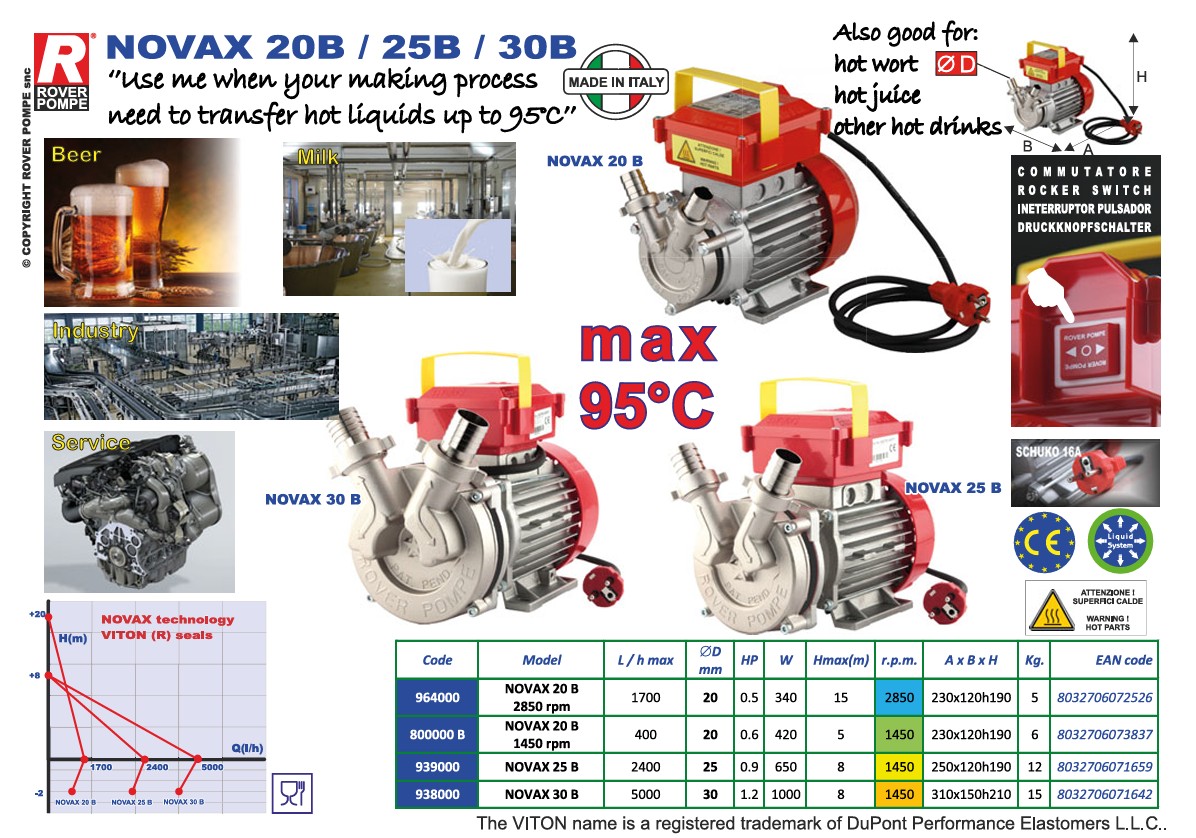 Οι ανοξείδωτες ηλεκτροκίνητες αντλίες της σειράς “NOVAX” ενδείκνυνται ιδιαίτερα για τη μετάγγιση υγρών στον τομέα τροφίμων. Το υδραυλικό τμήμα είναι εξ ολοκλήρου κατασκευασμένο από ένα ειδικό ανοξείδωτο κράμα. Αυτή η νέα τεχνολογία μας επιτρέπει να χορηγούμε το σημαντικό Πιστοποιητικό Καταλληλότητας για τη μετάγγιση Οίνου και υγρών τροφίμων με παρόμοια χαρακτηριστικά. Η συγκεκριμένη σειρά χρησιμοποιέιτε όταν η διαδικασία παρασκευής σας χρειάζεται να μεταφέρει ζεστά υγρά έως και 95°C.