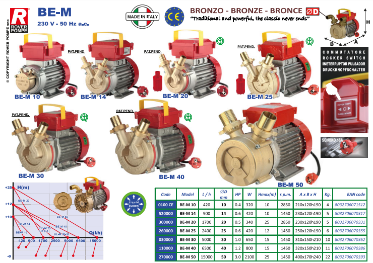 Ηλεκτροκίνητες αντλίες αυτοπληρούμενες, ορειχάλκινες με μοτέρ μονοφασικού εναλλασσόμενου ρεύματος, για μετάγγιση καθαρών υγρών όπως νερό, κρασί, πετρέλαιο, λάδι, μίγματα, όπου δεν απαιτείται συμμόρφωση με ιδιαίτερες προδιαγραφές. Συνεχής λειτουργία.